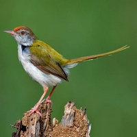 The common tailorbird (Orthotomus sutorius) is a songbird found across tropical Asia. Popular for its nest made of leaves "sewn" together and immortalized by Rudyard Kipling in his Jungle Book, it is a common resident in urban gardens. Although shy birds that are usually hidden within vegetation, their loud calls are familiar and give away their presence.Learn More